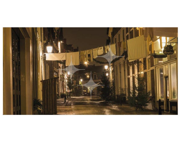 Foto (landschap) geprint op doek 6x3 mtr (BxH), kerst, Deventer, Dickens, avond, waslijn