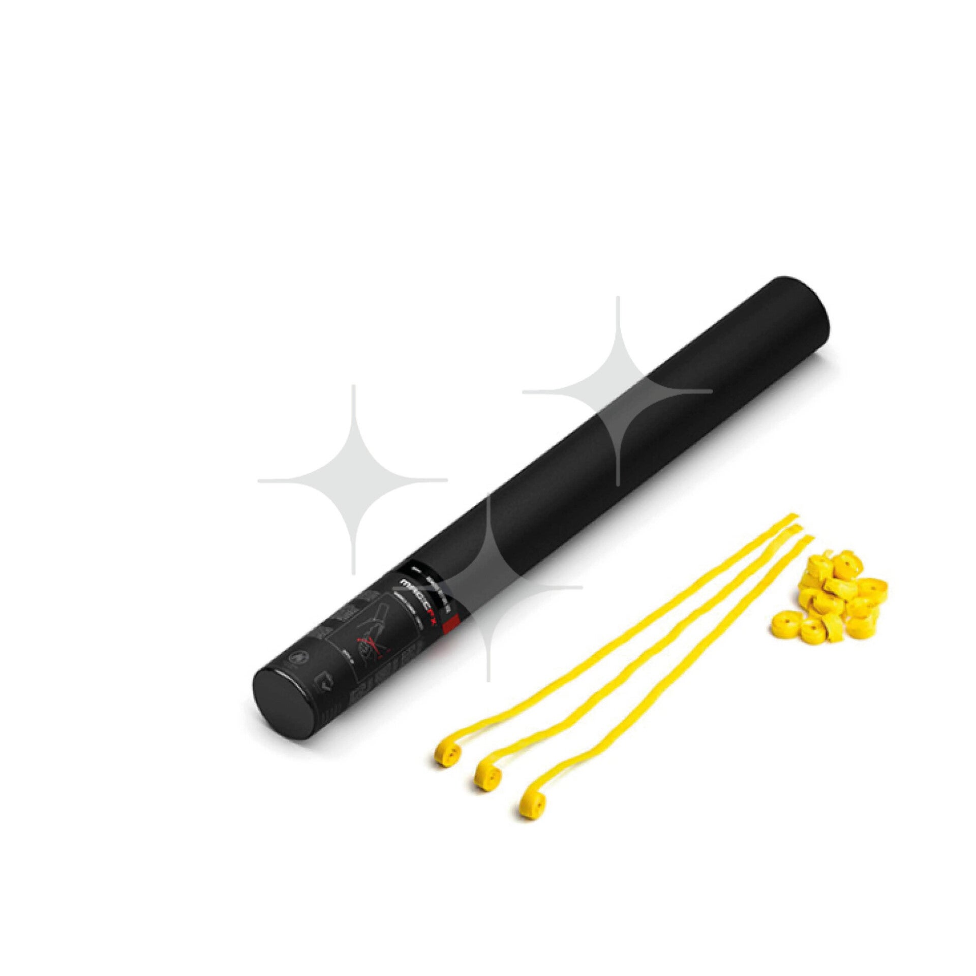 Met de Handheld Streamer Shooters van 50 cm schiet je vlamvertragende (B1) gele papieren slierten de lucht in. Deze krachtige confetti kanonnen kunnen streamers tot wel 12 meter ver schieten. Het papier is TÜV OK-Biodegradable gecertificeerd, wat betekent dat ze op milieuvriendelijke wijze afbreken.