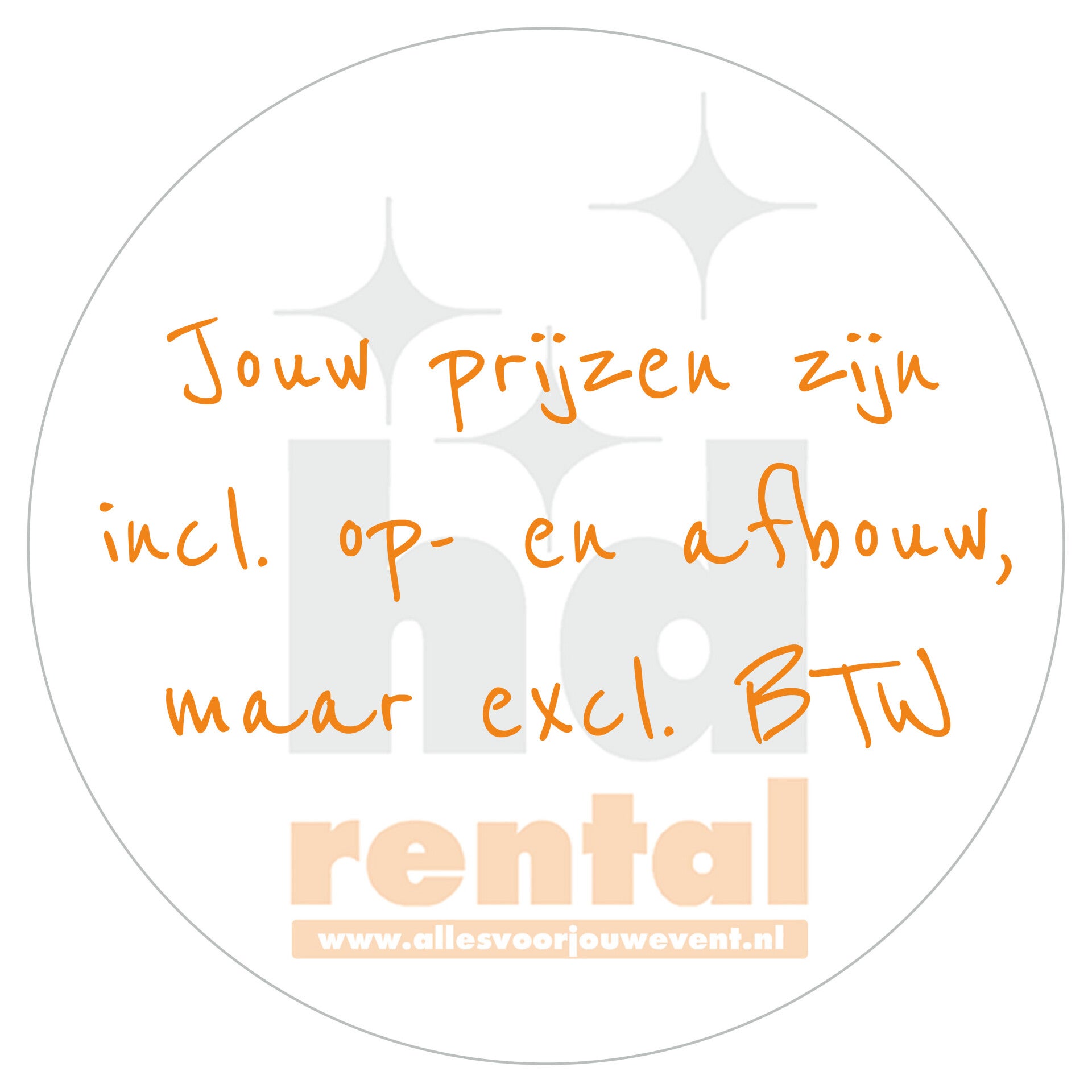 Vul bij opmerkingen jouw eventdatum in. Meerdere eventdagen? Houd rekening met extra kosten voor de volgdag(en). Onze prijzen zijn exclusief BTW en transport, maar inclusief op- en afbouw (tenzij anders vermeld).