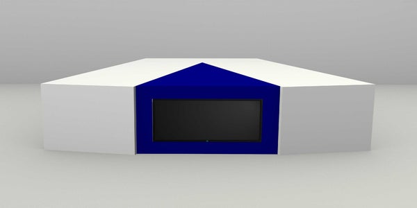 Grote presentatietafel voor talkshow / podiumsetting. Deze forumtafel biedt plaats aan 7 personen (1 presentator / host en 6 gasten)
