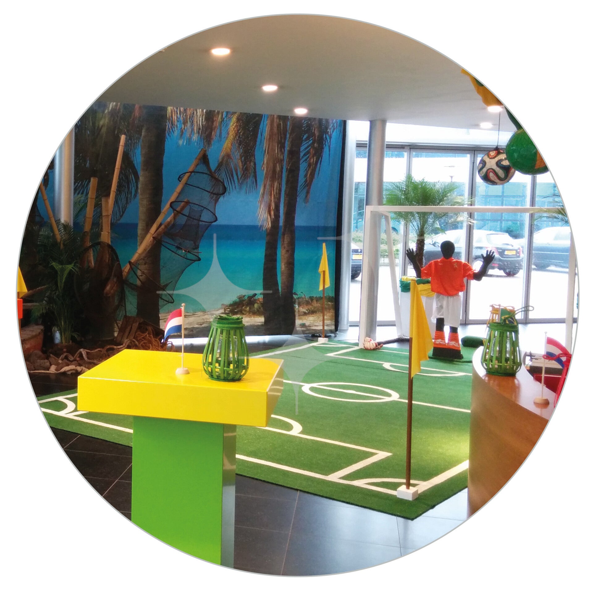 Opzoek naar een decoratief voetbalveld? Wij kunnen een kunstgras voetbalveld met belijning verzorgen. Bij het voetbalveld horen natuurlijk ook cornervlaggen en een voetbal goal.